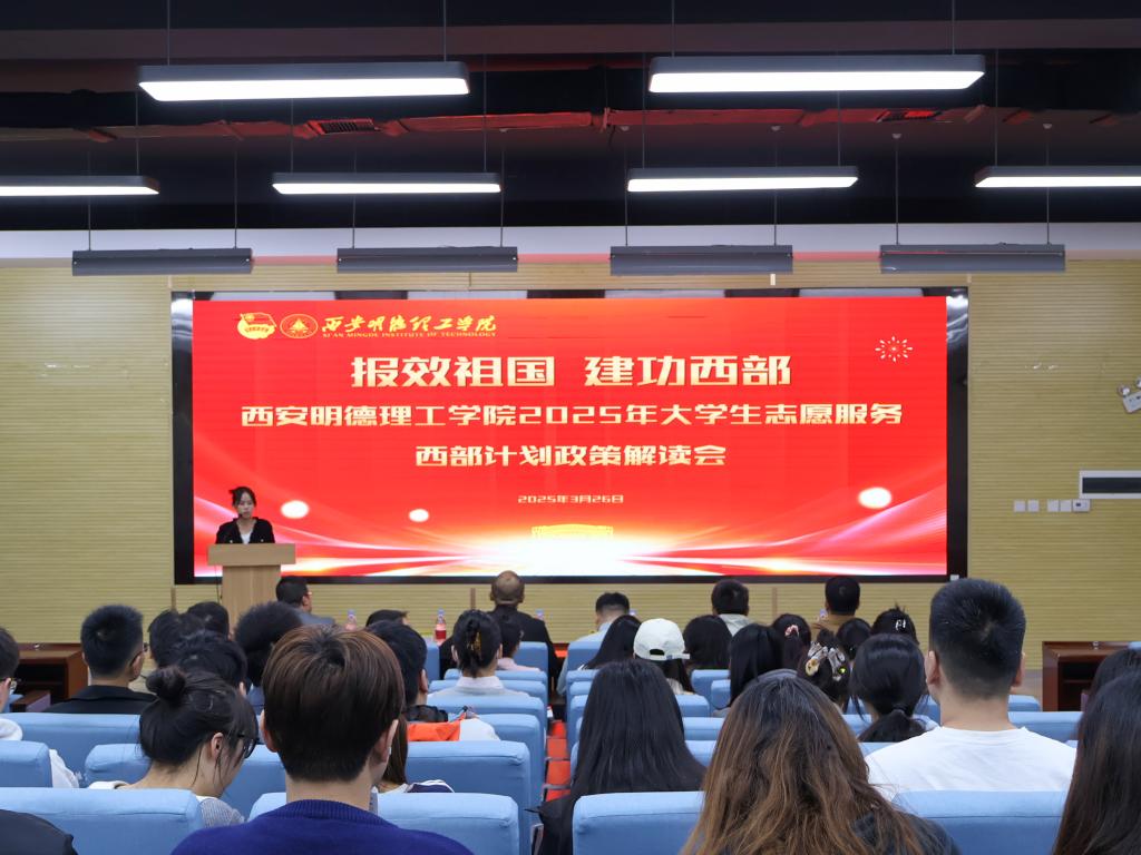 为深入贯彻落实国家关于大学生志愿服务西部计划的决策部署,引导广大青年学子投身西部建设、服务国家发展,3月26日下午,学校党委学生工作部、校团委、招生就业中心、毕业班年级组在建德楼202报告厅联合召开2025年大学生志愿服务西部计划政策解读会。相关部门负责人、各学院党委(党总支)副书记,全体毕业年级辅导员及2025届毕业生代表近200人齐聚一堂,共同聆听政策解读,感悟志愿精神,激扬青春理想。