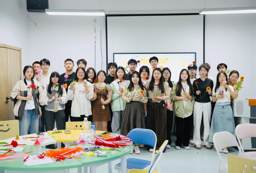 信息工程学院的8名学生化身教学扭扭棒的“花花使者”,为现场同学送去真挚祝福。在“花花使者”的悉心指导下,同学们按照“玫瑰组”“思念组”“愿望组”“烦恼组”“春日组”投入到手工创作中。一根根五彩斑斓的扭扭棒在大家手中翻转、变形,藏着心事的花蕊纸团,逐渐化作一朵朵绚丽绽放的花朵,承载着同学们的情感与希望。活动尾声,同学们纷纷合影留念,用镜头定格这一美好而难忘的瞬间。