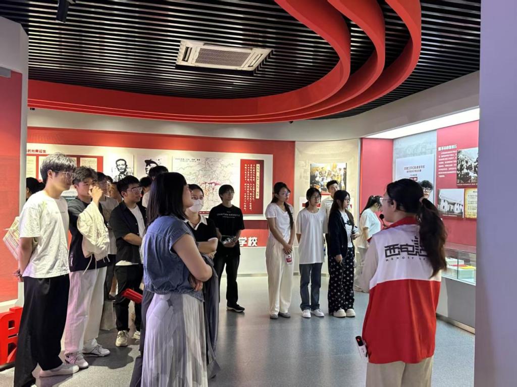 师生先参观了西安电子科技大学校史馆。展馆以“半部电台起家,长征路上办学”为主线,通过珍贵实物与历史档案,展现了学校自1931年中央军委无线电学校以来的红色历程。同学们驻足于“长征路上办学”主题墙前,聆听老一辈西电人在行军中坚持教学的故事;在“西迁精神”展区,1958年建校时的苏联风格主楼图纸,让师生感受到“国家需要即方向”的担当。