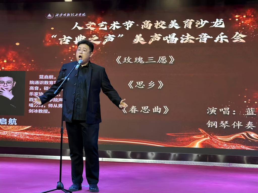 活动伊始,蓝启航老师以一曲黄自先生的艺术歌曲《玫瑰三愿》优雅开场,其醇厚优美的嗓音瞬间引领观众步入古典音乐殿堂。他随后演唱的《思乡》、《春思曲》深情款款,展现了中国近现代艺术歌曲的独特韵味与民族情怀,也拉开了整场音乐盛宴的序幕。