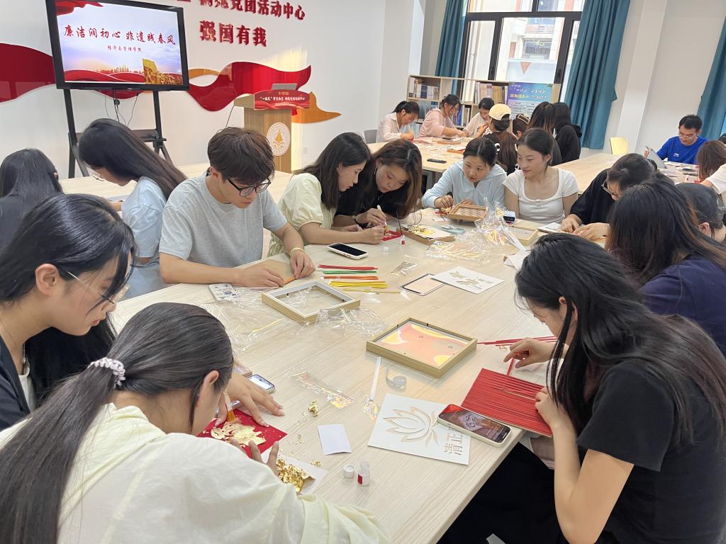 随后,大家共同参与了非遗金箔画的制作。金箔画工艺精细,需耐心打磨、细致贴金,正如廉洁品格的养成需要持之以恒的坚守。同学们在创作过程中,将廉洁元素融入画作,以艺术形式表达对清廉文化的理解。一幅幅金箔画作品不仅展现了非遗技艺的魅力,更传递出崇廉尚洁的价值理念。同学们纷纷表示,此次主题党日活动形式新颖、内容丰富,既加深了对廉洁文化的认识,又感受到中华优秀传统文化的博大精深。