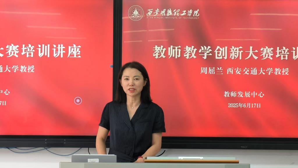 为助力广大教师深入探索教学创新路径,备战即将到来的校内教学创新大赛决赛,深化教育教学改革,提升人才培养质量,学校于6月17日举办教师教学创新大赛专项培训讲座(第一场)。本场培训特邀西安交通大学能源与动力工程学院教授、首届全国高校教师教学创新大赛一等奖、国家级教学竞赛评审专家周屈兰担任主讲嘉宾。本次讲座以“深度复盘 精准设计”为主题,吸引了全校50余名教师参与,现场氛围浓厚,反响热烈。