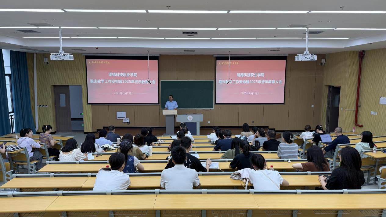为进一步深入贯彻中央八项规定精神,坚决做到学习教育见行见效,切实改进会风,持续推进作风建设,明德科技职业学院将期末教学工作安排部署会、2025年警示教育大会、教职工政治理论学习会一起谋划,并于6月19日下午在8号教学楼102教室顺利召开,全体教职工参加了此次会议,会议由党总支副书记王飞主持。