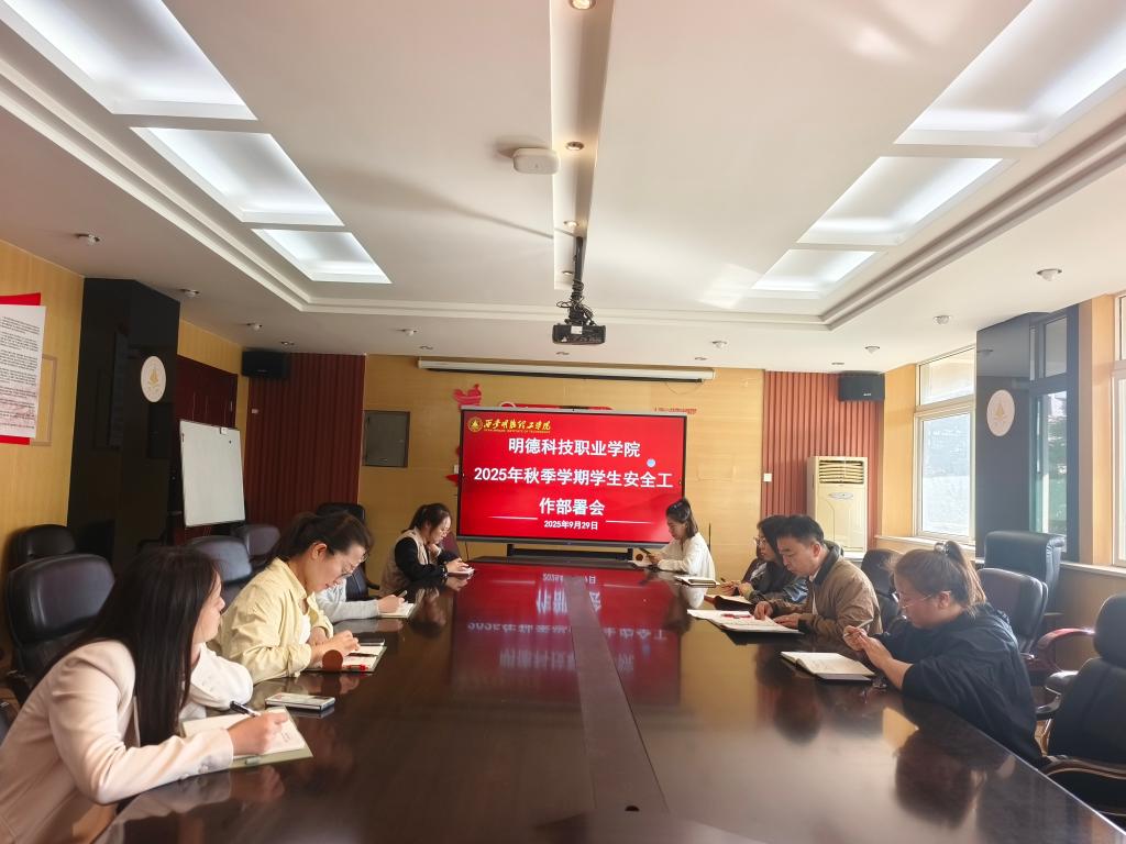 为全面贯彻落实上级关于校园安全稳定的工作部署,切实保障新学期教育教学秩序平稳有序,筑牢学生安全防护网,明德科技职业学院在长安校区明理楼216会议室、莲湖校区德雅楼A102会议室线上线下联合召开了2025年秋季学期学生安全工作部署会。党总支书记王庭良及全体辅导员参加会议。会议由学院党总支副书记王飞主持。