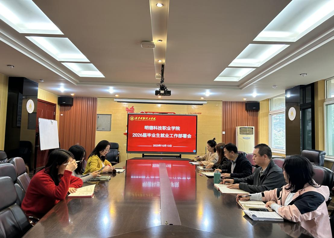 10月13日下午,明德科技职业学院在明理楼216会议室召开2026届毕业生就业工作部署会。学院党总支书记王庭良、副书记王飞及全体毕业班辅导员老师参加会议。