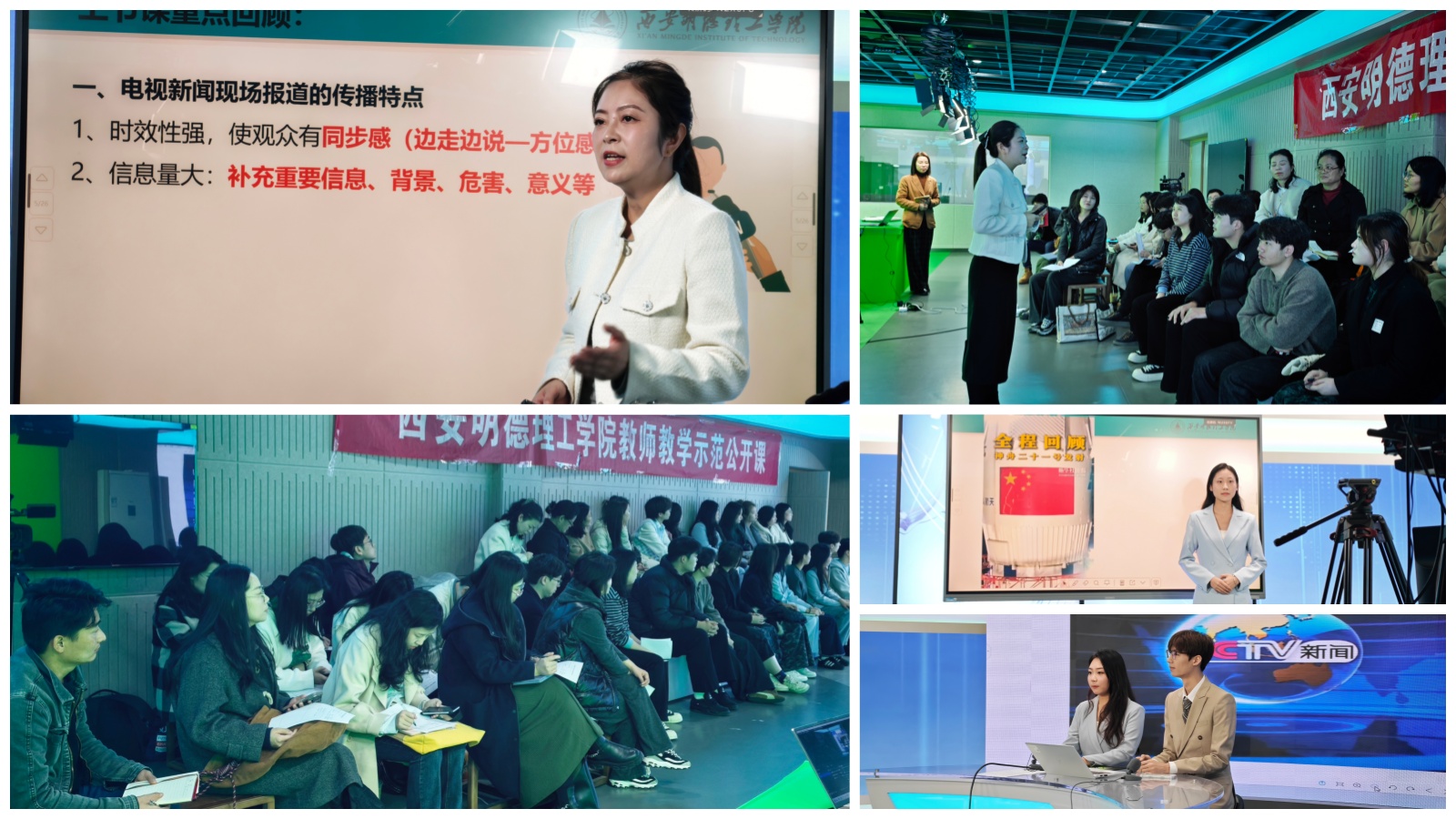 11月6日,第14期示范课在2号实训楼413教室由艺术与设计学院何婕老师主讲《电视节目播音与主持》。何婕老师巧妙地将“神州二十一号在太空烤鸡翅”等社会热点新闻作为教学素材,引导学生快速组织播报内容,将理论学习与即时实践紧密结合。课堂上,一组学生现场进行了新闻播报展示,生动展现了在真实情境下专业知识的应用。这种创新融合时事热点的教学方法,有效激发了学生的学习兴趣,锻炼了其临场应变和专业表达能力。