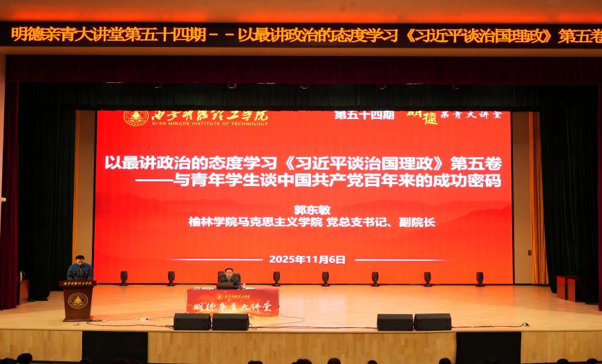 2025年11月6日晚,beat365第五十四期“明德亲青大讲堂”在四季廊桥报告厅隆重举行。本次讲座邀请到西北大学博士、陕西优秀思政课教师、第二届陕西省党史专家库成员、共青团陕西省委讲师团成员、榆林市委理论宣讲人才库成员、榆林学院马克思主义学院党总支书记、副院长、副教授、硕士研究生导师郭东敏作题为“以最讲政治的态度学习《习近平谈治国理政》第五卷——与青年学生谈中国共产党百年来的成功密码”主题讲座。讲座由信息工程学院党委副书记高长江主持。
