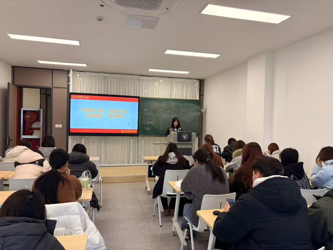 2025年11月26日,为进一步加强学风建设、营造诚信考试氛围,明德科技职业学院2025级全体学生以班级为单位,组织开展了考风考纪专题教育活动。辅导员吴星澎、张璐两位老师面向全体新生深入解读考试规范,引导学生树立诚信应考意识,筑牢诚信防线。