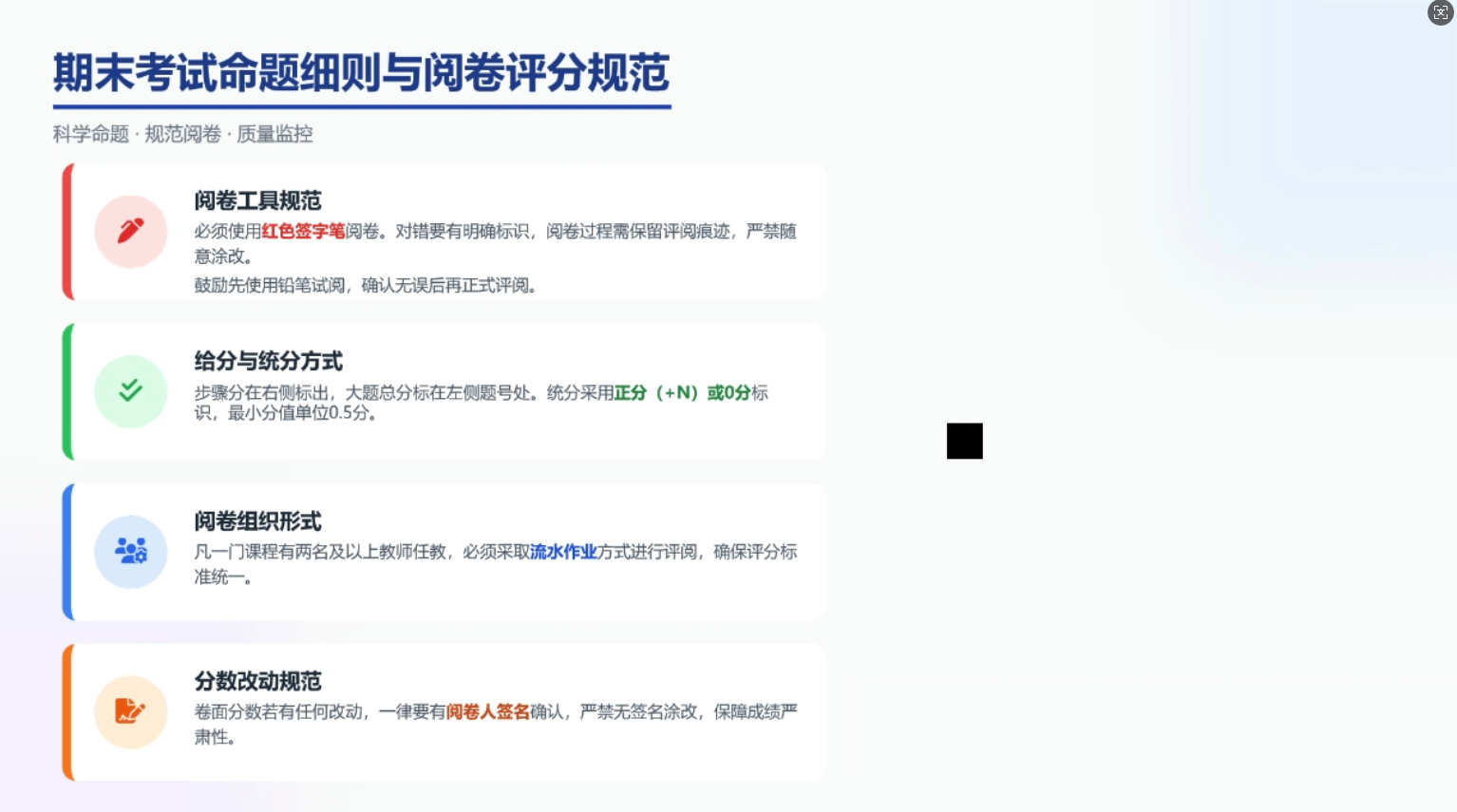 会上,于莉副院长首先传达了2025-2026学年第一学期第四次教学工作会议要求及精神,随后围绕八大核心工作作出详细部署。在人才培养与教学大纲建设方面,明确需完成2024年人才培养方案、课程教学大纲及岗位实习课程大纲的修订工作。针对本学期末期末考试,强调已完成前期部署与命题审查,所有试卷全部收齐,要求严格执行考试命题细则、阅卷评分规范及试卷归档标准。就2025-2026学年第二学期排课工作,明确相关规定要求,旨在规范教学运行秩序、优化课程资源配置。同时,会议对课程与课堂教学、教学资料管理、岗位实习质量管控、实验室规范运营及教学科研仪器设备使用等工作提出具体要求,强调仪器设备使用需真实记录、严禁补记,实行定期核查的闭环管理,实验室相关文档填写需严格规范。此外,会议还提倡任课教师要积极运用AI技术开展教学,推动产教融合课程建设与数智化教学深度融合,提升育人效率。