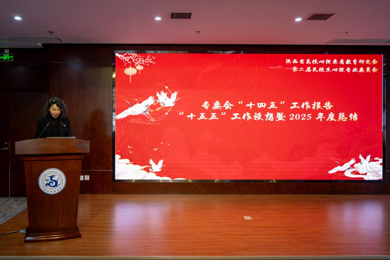 在工作报告环节,民校生心理专业委员会主任委员、西安培华学院党委副书记姚文静,作专委会“十四五”工作总结及“十五五”工作计划的报告。报告回顾了专委会在心理育人体系建设、学术交流、实践活动等方面的成果,明确了未来五年“心理育人+艺术疗愈”融合发展的核心方向。