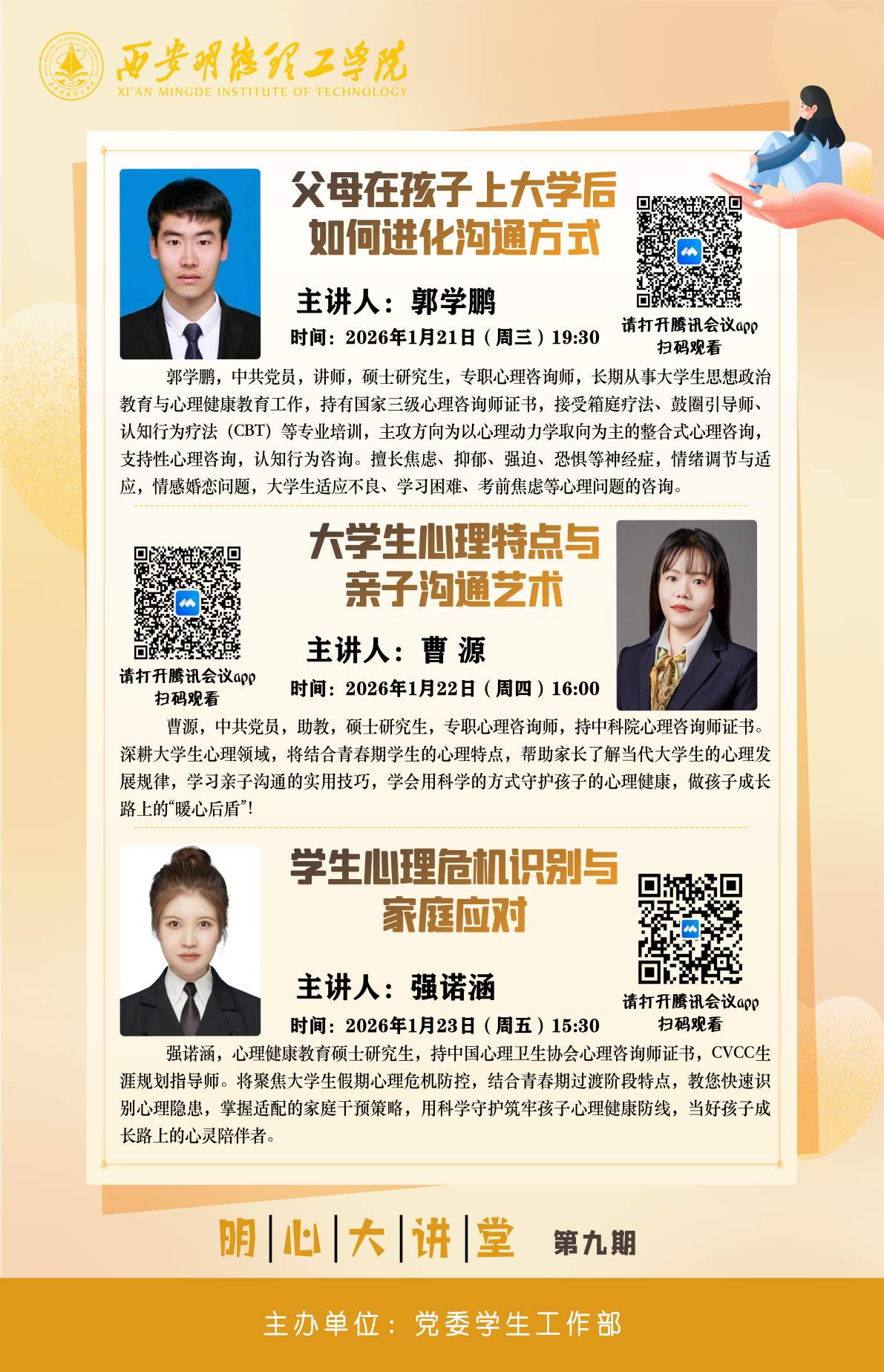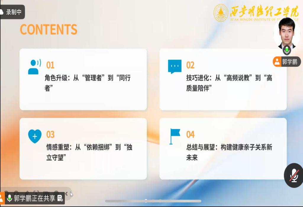 2026年1月21日晚,专职心理咨询师郭学鹏以线上微课形式,为全体在籍学生家长带来《父母在孩子上大学后如何进化沟通方式》专题分享,旨在破解代际沟通壁垒,筑牢家校协同育人防线。讲座中,郭学鹏结合多年心理咨询实战经验与高校典型案例,深入剖析了大学生独立意识觉醒与家长保护惯性之间的核心矛盾,指出“指令式说教”“过度干涉”等传统沟通模式的局限。他提出,家长需完成从“管理者”到“支持者”的角色转型,通过“共情式倾听”“非暴力表达”“边界感守护”三大核心技巧,搭建亲子信任桥梁。针对远距离沟通难题,他还分享了“正向反馈优先”“话题轻量化”等实用方法,引导家长以平等姿态走进孩子内心。本次微课得到家长广泛好评,在线互动区留言踊跃。家长们表示,讲座直击亲子沟通痛点,提供的技巧可操作性强,不仅帮助自己理清了教育思路,更深刻认识到科学沟通对孩子心理健康的重要意义。此次活动是学校完善“三全育人”体系、深化家校心理共育的重要举措,为护航大学生健康成长注入了温暖力量。
