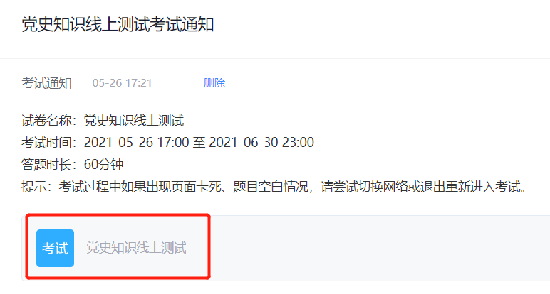 登陆成功后选择“收件箱”,点击“党史知识线上测试考试通知”。