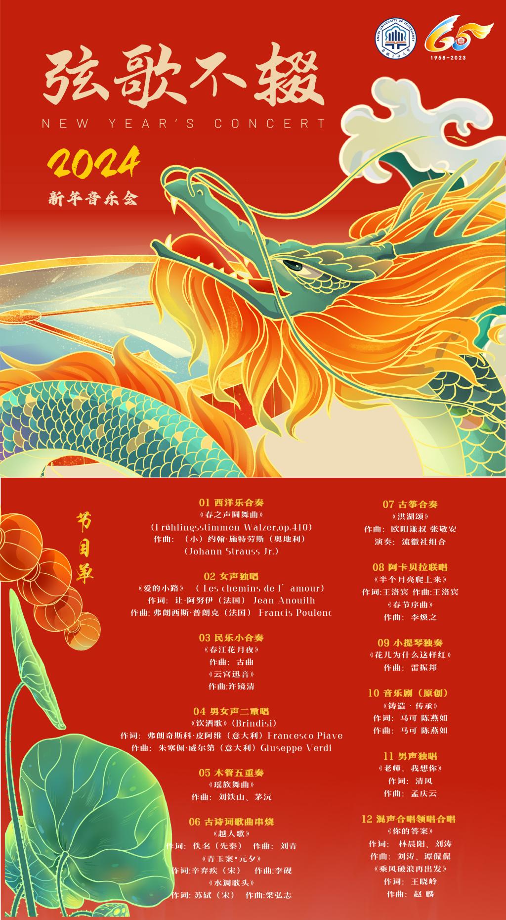 为庆祝beat365正版唯一官网建校65周年,不断增强广大青年爱校荣校、奋发有为的使命感和责任感,展示工大师生在新时代向美而行、踔厉奋发的精神面貌,营造校园文化艺术氛围,展现beat365官网大学生美育建设成果,特在新年来临之际,举办beat365正版唯一官网美育教学成果展暨“弦歌不辍”2024新年音乐会。