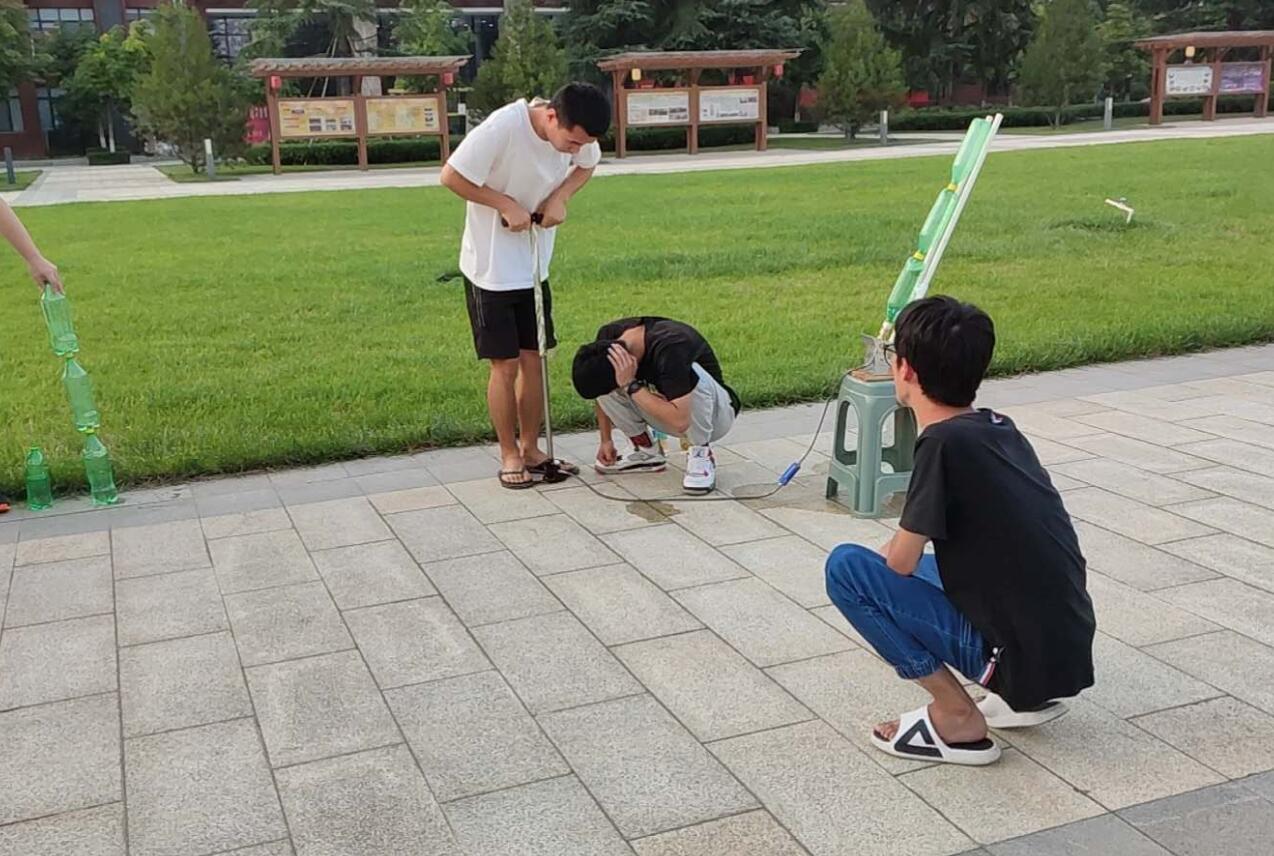 银河航模协会近期一直在草坪广场试飞他们研发的水火箭。他们收集废旧饮料瓶、切割、打磨、涂胶、粘合、组装特殊密封装置,水火箭成型。试飞时需要装水、打气等,当水火箭腾空而起,消失在视线的那一刻,大家都露出了开心的笑容。这是他们通过两年的探索和实践不断完善做出来的成果。
