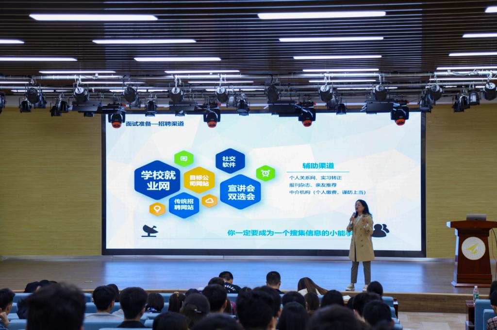 首先,蔡文静书记对马蕊的专业领域和工作成就做了简介,并对马蕊的到来表示热烈的欢迎。接着,马蕊围绕大学生如何轻松应对求职展开讲解,凭借深厚的专业理论沉淀以及丰富的相关工作经验,深入浅出地为同学们讲述了唤醒自身就业意识的重要性;大学生在求职前需要做的准备工作,包括简历制作、面试准备等。随后,马蕊为同学们分析了求职过程中可能遇到的困难及常见错误,并针对性提出相应提高、改善的策略。马蕊特别强调每次求职之后,同学们都应该总结复盘,用平衡轮找到自己的黄金平衡点,做出适合自身的选择。