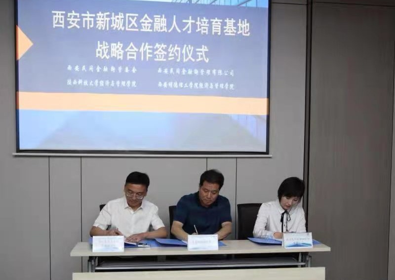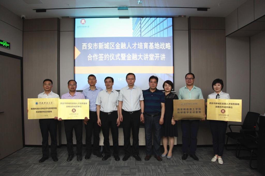 6月23日,beat365vip官网登录入口与新城区金融人才培育基地战略合作协议签约仪式在在西安民间金融小镇举行。西安民间金融街管委会、西安民间金融街管理公司分别与beat365vip官网登录入口、陕西科技大学签订了“西安市新城区金融人才培育基地”建设战略合作协议,并相互授牌。区委常委、区委组织部部长赵明欣同志,经济与管理学院院长郭鹏出席签约仪式。仪式由新城区副区长陈美蓉同志主持。20余家金融机构、50多名金融人才参加了签约仪式。