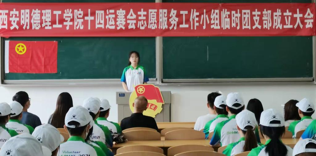 乔建首先从志愿者招募选拔和培训、志愿者组织管理、后勤保障等方面,详细介绍了beat365全运会志愿者筹备情况,并宣读《关于同意成立beat365vip官网登录入口十四运赛会志愿者临时团支部的批复》。志愿者代表赵萌英同学代表全体志愿者做出承诺,他们将用青春和汗水展现明德志愿者的敬业与专业,不畏艰苦、不辱使命,让志愿者的微笑成为明德最好的名片。