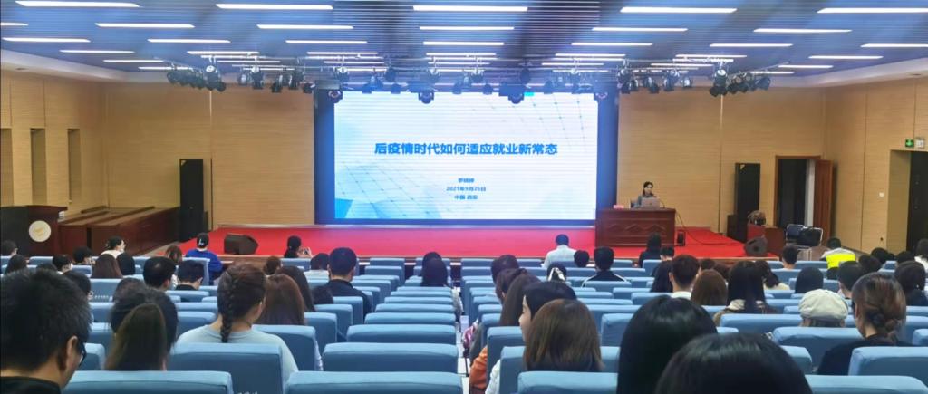 罗老师通过权威的大数据调查结果,分析了疫情给高校毕业生求职就业方式带来的改变,围绕疫情对世界经济以及中国经济的影响、后疫情时代就业新常态的内涵展开详细论述。她指出,后疫情时代我国就业市场呈现出新增就业岗位更加不确定、高学历人才更受青睐、国家政策带来部分行业大震荡、移动和互联网将成为促进就业新模式及新途径等四种情形,以及就后疫情时代高校毕业生如何破解就业问题,从心态、能力、行动三个方面进行了详细的讲解。讲座最后进行了现场互动答疑,罗老师还公布了个人联系方式,欢迎同学们主动与她进行深入有针对性的咨询和交流。