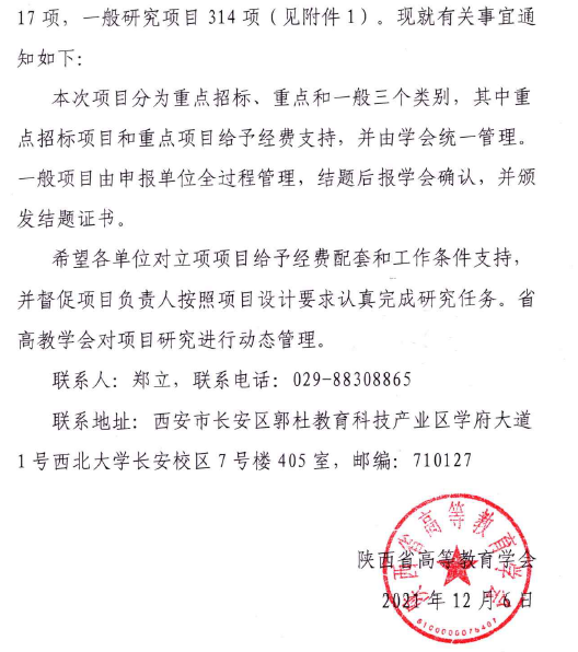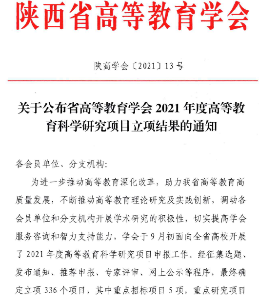 12月6日,陕西省高等教育学会发布《关于公布省高等教育学会2021年度高等教育科学研究项目立项结果的通知》陕高学会〔2021〕13号,beat365立项四项课题,全部由经济与管理学院教师主持或参与。