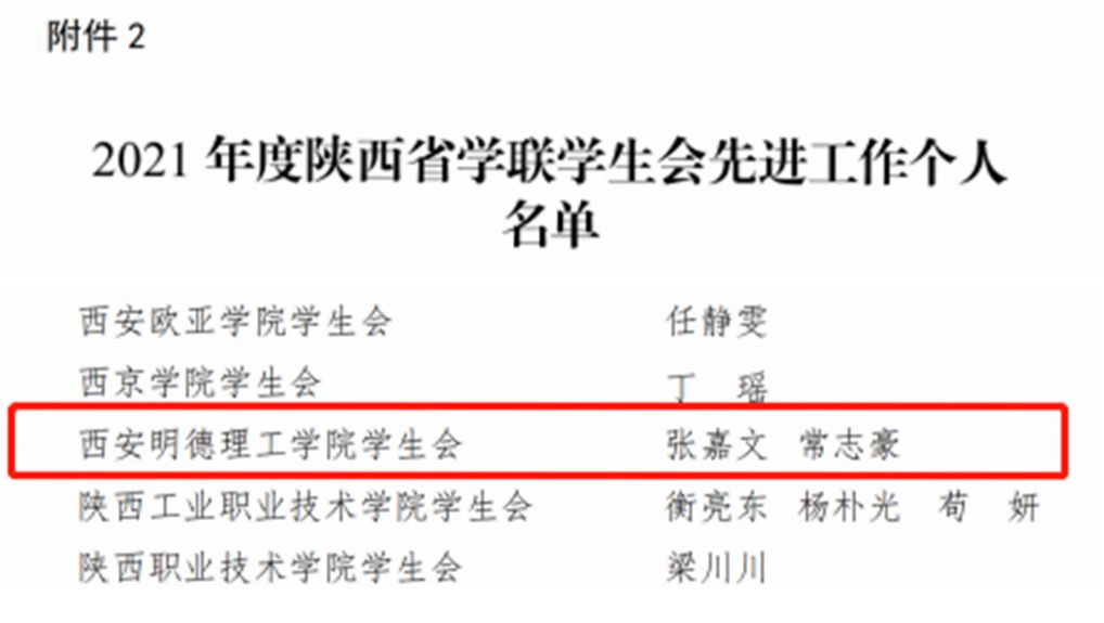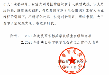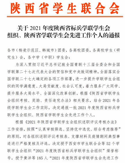 近日,陕西省学生联合会发布了《关于2021年度陕西省标兵学联学生会组织、陕西省学联学生会先进工作个人的通报》,其中beat365学生会被评为“2021年度陕西省标兵学联学生会组织”,张嘉文、常志豪两名学生荣获“2021年度陕西省学联学生会先进工作个人”称号。