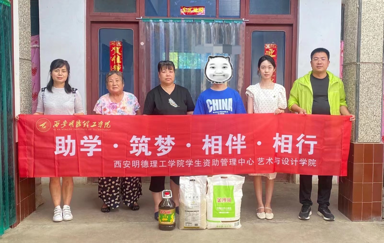 暑期,为进一步贯彻落实高校家庭经济困难学生资助政策,做好学生资助政策的宣传工作和高校家庭经济困难学生助学、筑梦工作,艺术与设计学院党委副书记刘雄、办公室主任吴君、辅导员韩璐、韩熠一行四人前往咸阳市泾阳县石塔庄村,开展“助学.筑梦.相伴.相行”活动,并为家庭经济困难学生送去米面和食用油等慰问品,转达了学校的关怀和问候。