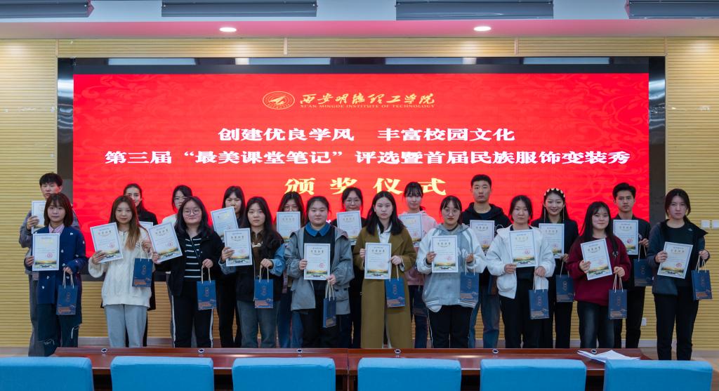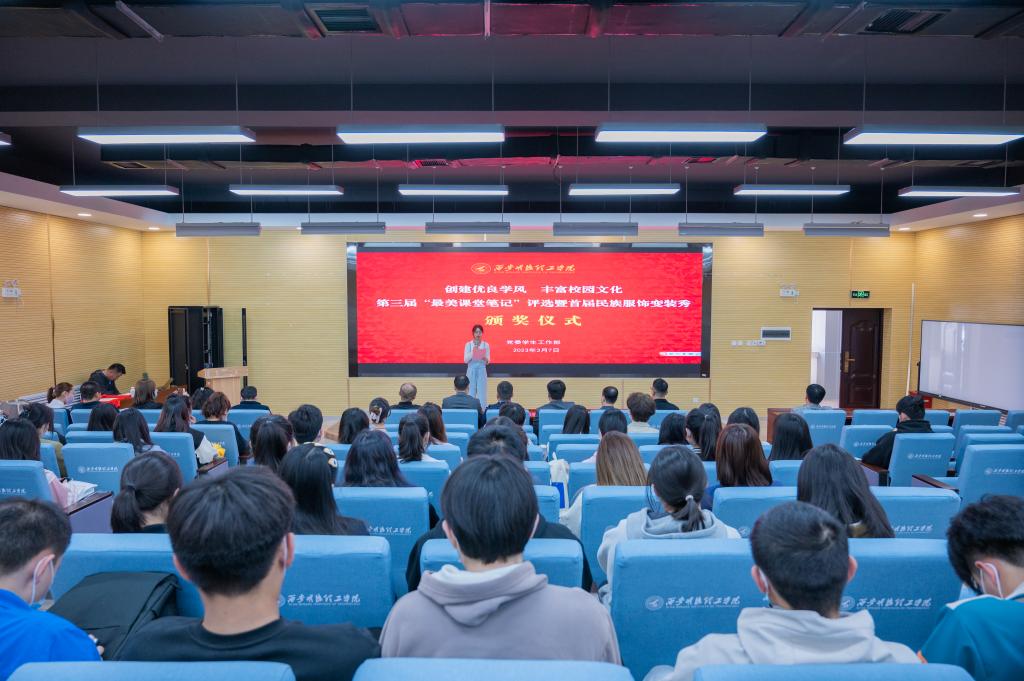 侧耳倾听教诲,埋头奋笔疾书,感悟学习之美,展示民族传统。为创建优良学风、丰富校园文化,3月7日中午,第三届“最美课堂笔记”评选暨民族服饰变装秀颁奖仪式在建德楼202报告厅举行。党委学生工作部相关老师、各学院学生工作负责人、学生代表等90余人参会,王飞老师主持颁奖仪式。