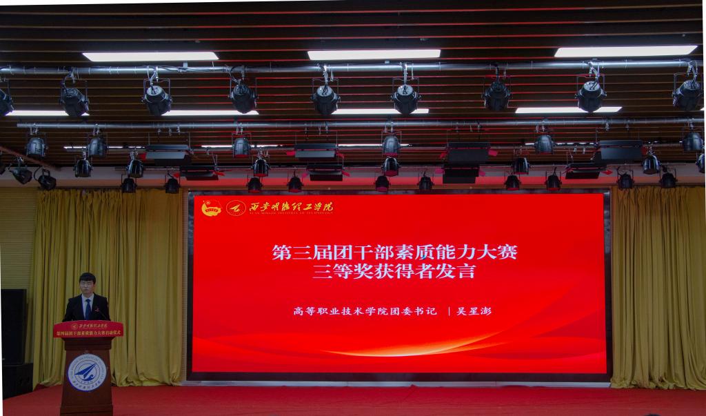 高等职业技术学院团委书记吴星澎进行分享发言。他通过介绍自身参赛经历,与大家共同分享他的参赛心得,详细讲述了他在比赛中遇到的各种问题,为大家作赛前经验指导,并鼓励大家积极参与比赛。