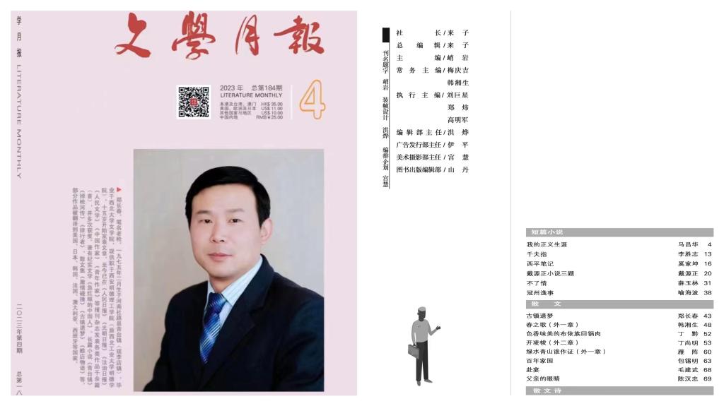 日前,beat365党委组织宣传部郑长春老师荣登2023年第4期《文学月报》杂志封面人物,当期杂志还配发了他近万字的散文佳作《古镇遗梦》。