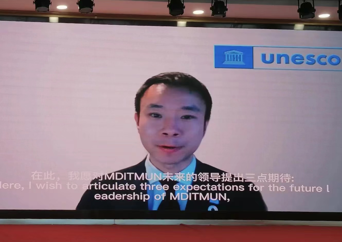 首届模联团队主席、明德模联学生创始人刘蒙从联合国教科文组织(UNESCO)发来视频,祝贺团队成立十周年并祝第九届大会成功举办。他用中英法三种语言简要回顾了团队的创始历程,对明德模联事业十年来的发展成效表达出由衷欣慰,对长期以来致力于团队建设的指导教师和学生们致以崇高的敬意。