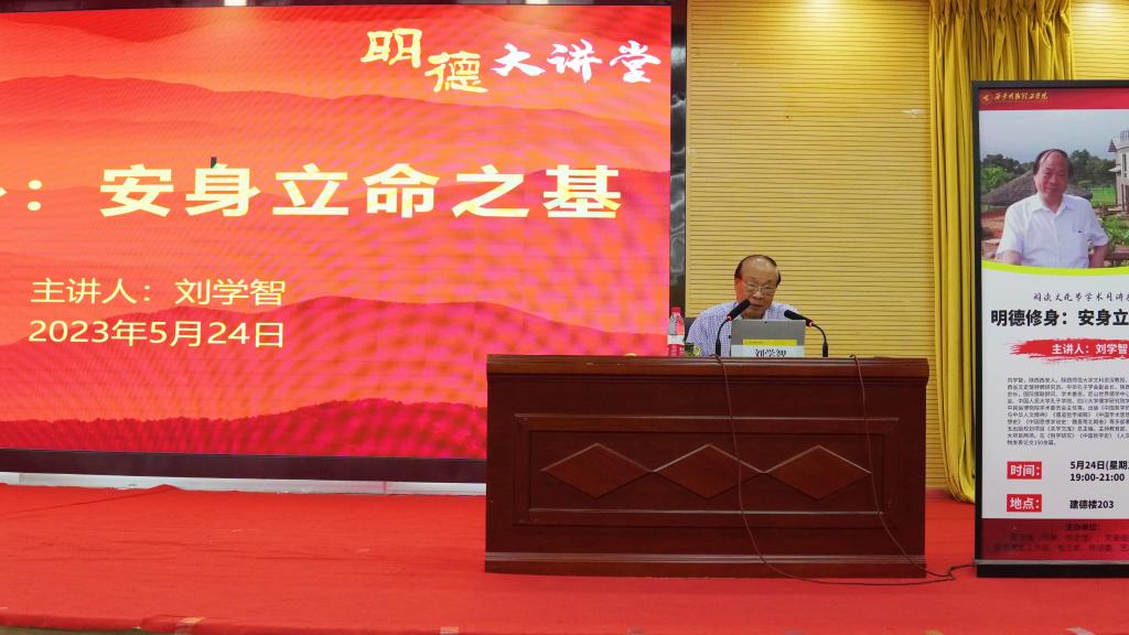 2023年5月24日晚上,图书馆(档案、校史馆)联合党委组织宣传部、党委学生工作部、校团委、校工会在建德楼203报告厅举办学术月第三场讲座。本次讲座特邀陕西师范大学文科资深教授、博士生导师刘学智教授主讲。讲座的主题是《明德修身:安身立命之基》。讲座由图书馆(档案、校史馆)馆长王爱霞主持,教师代表和200余名学生现场聆听讲座。同时,该讲座线上同步直播,线上有2900余名师生聆听了讲座。