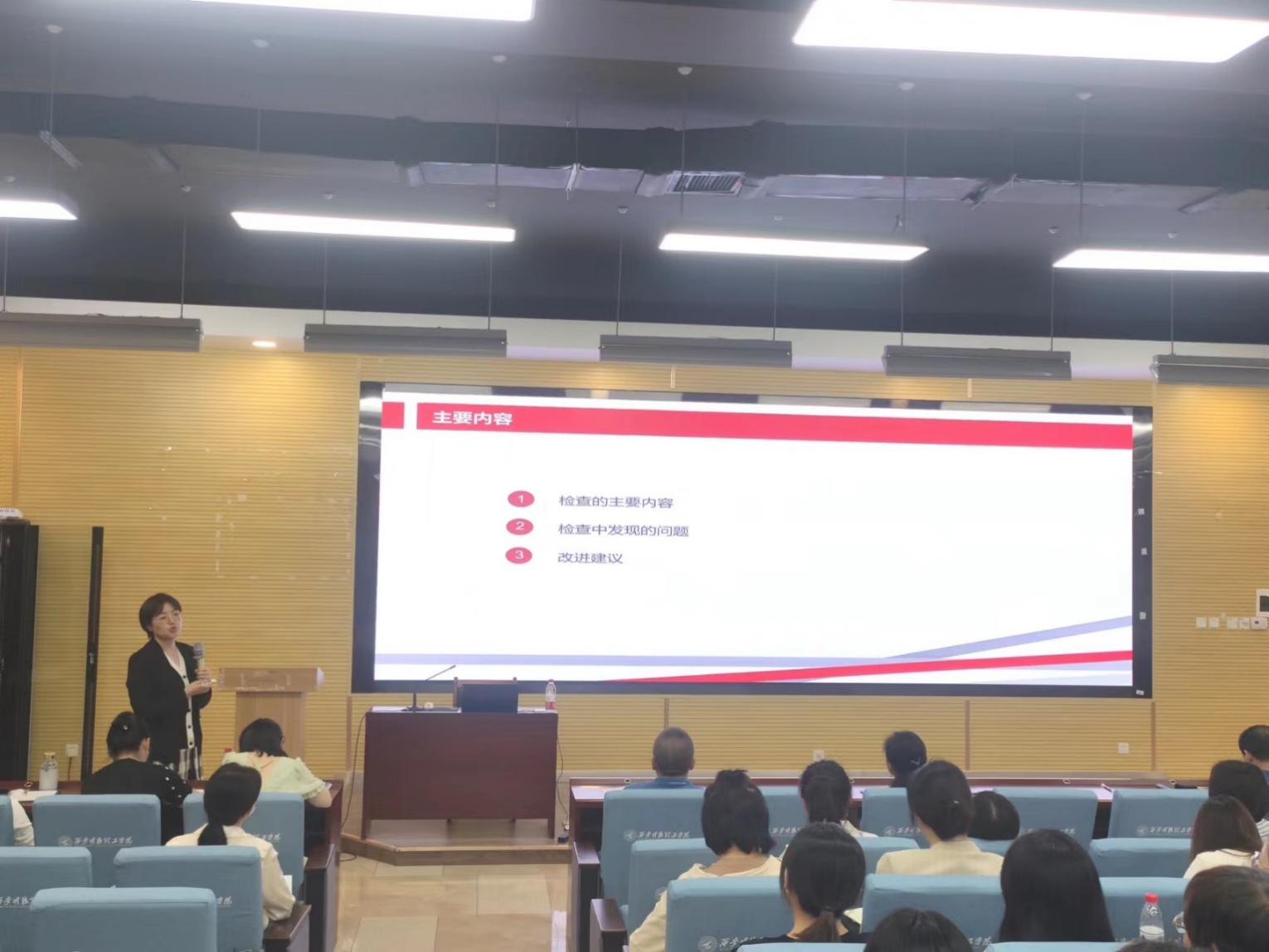 会议伊始,教务处处长朱延波对期中教学检查工作情况进行了总结,并对会议的内容和目的作了说明。教务处及质量管理与评估办公室分别对教学计划执行情况、实践教学实施情况、试卷归档情况、毕业论文、实验与实习情况、听课制度落实情况、教学资料以及教风学风等方面发现的问题进行了反馈,并提出相应的改进建议。