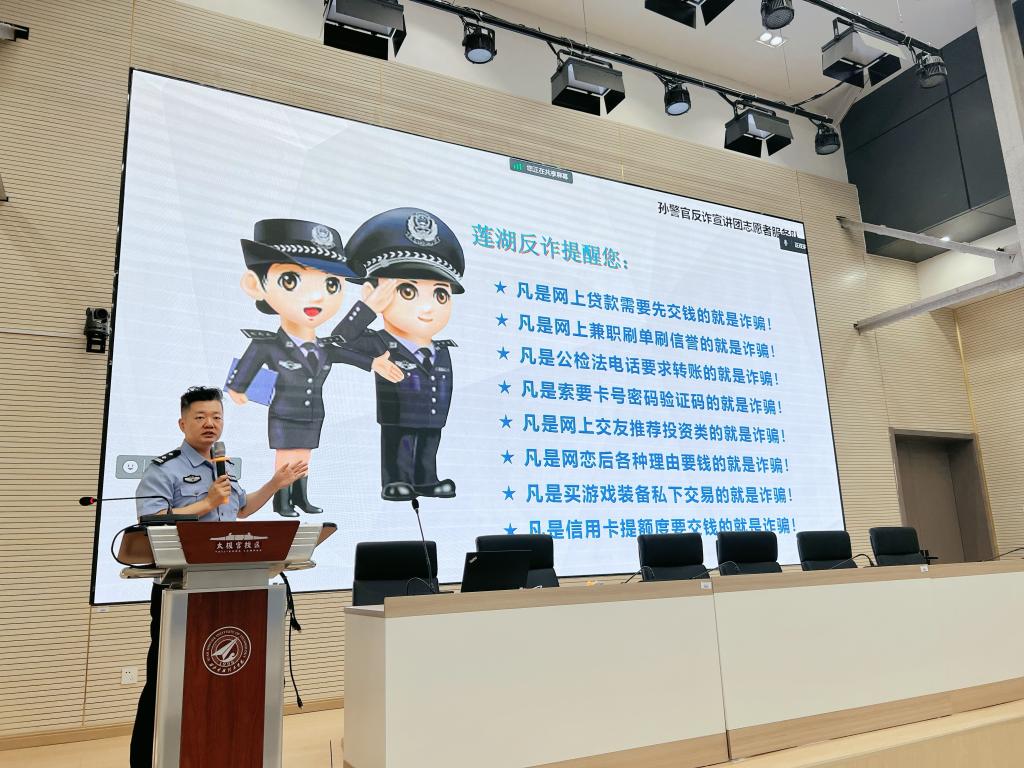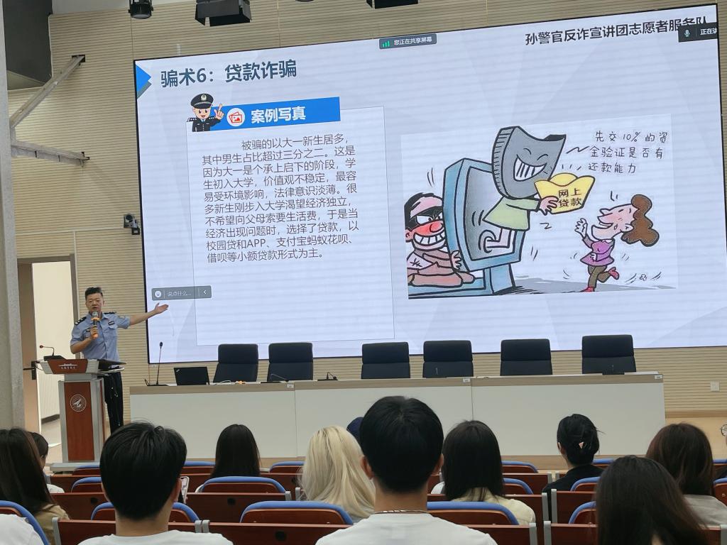 讲座上,孙所长分别从什么是电信诈骗、电信诈骗的常见形式、如何识别防范电信诈骗以及上当后的补救措施四个方面为同学们进行了深刻的讲解。孙警官深入浅出,用真实案例生动活泼的讲授了电信网络诈骗的特点、种类以及惯用手段,针对经常发生的杀猪盘、兼职刷单、网络购物诈骗、游戏装备交易诈骗等骗局,提醒广大学生一定要保护好个人隐私,不要轻易相信各类短信、中奖等诈骗信息,一旦受骗要及时向公安机关报案。