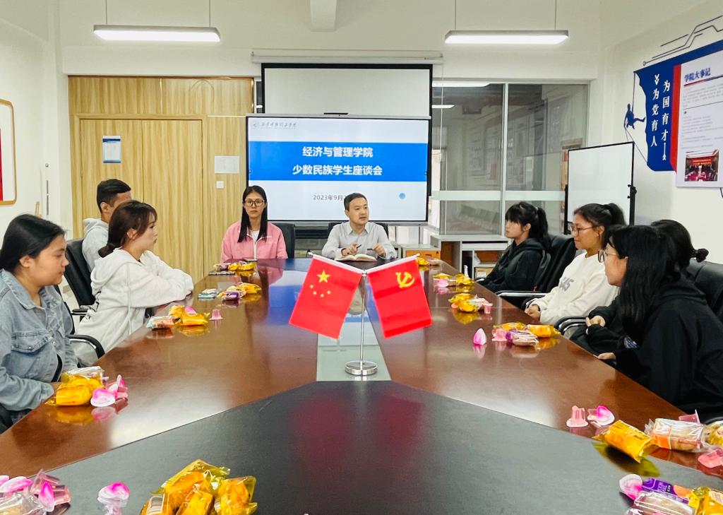 为贯彻落实中央民族工作会议精神,铸牢中华民族共同体意识,深化民族团结进步教育工作。9月27日下午,经济与管理学院在明志楼北606召开2023级新生少数民族学生座谈会,学院党委书记兼行政副院长何文举、新生辅导员罗夫惠、汪宏宇和少数民族学生代表参加了座谈会,会议由罗夫惠主持。