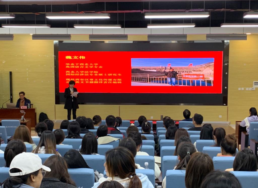 10月24日,语言文化传播学院在6号楼202室举办“学术科技月系列讲座”第一讲。西安汉尊文化传媒有限公司责任编辑魏文伟担任此次讲座的主讲人。院长马庆林,党委副书记杨峰,英语和翻译专业部分教师以及各年级的学生,共计200余名参加。讲座由翻译专业负责人杨艳卫副教授主持。