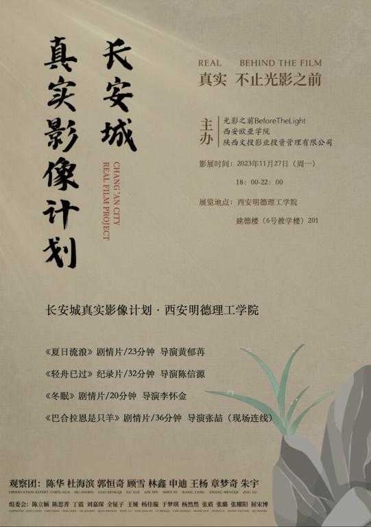 为提高艺术与设计学院2023级新生影视鉴析和制作水平,更好地培养未来影视制作类应用型人才,发展应用型课堂效力。11月27日晚,艺术与设计学院在建德楼201报告厅成功举办“2023长安城真实影像计划 beat365vip官网登录入口展映活动”,艺术与设计学院影视摄影与制作专业、数字媒体艺术专业大一新生,教师代表贾晓兰、黄德缘、杨宇堃、兰艳参与此次活动,活动由杨宇堃老师主持。此次展映共遴选出其中4部影片,展映影片为《夏日流浪》《轻舟已过》《冬眠》《巴合拉恩是只羊》。
