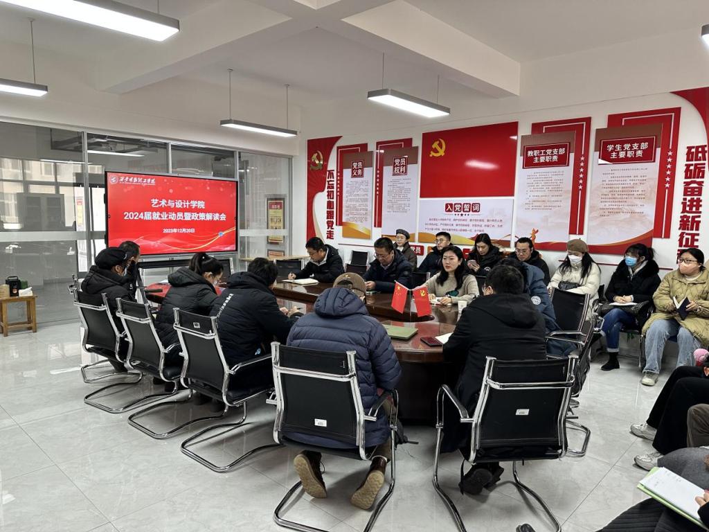 为优化就业措施,创新就业方法,助推2024届毕业生就业工作,艺术与设计学院近期召开2024届毕业生就业动员部署及政策解读会。会议采取线上线下结合的方式进行,招生就业中心办公室主任王育春应邀进行线下就业政策就读,毕业生辅导员张睿华线上进行就业指导业务培训。艺术与设计学院全院教职工参加会议,会议由学院党委书记雷宇主持。