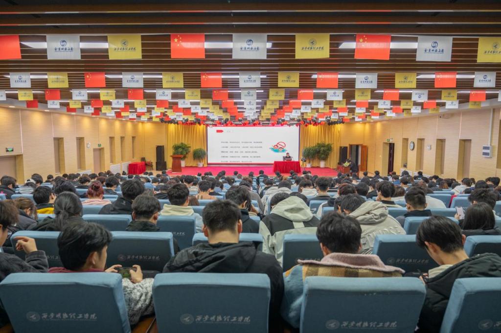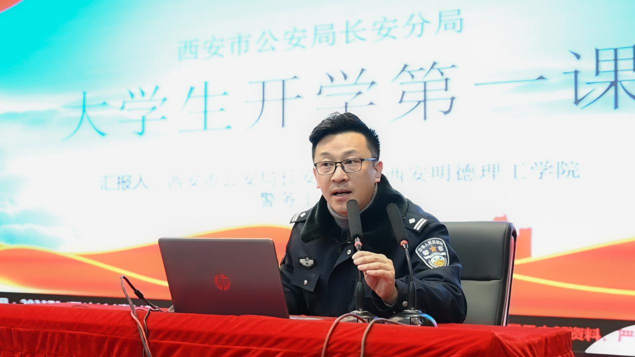 西安市公安局长安分局校园警务工作站贾维从心理健康、财产安全、消防安全、用电安全、生活安全、交通安全六个方面展开讲述,通过贴近大学生生活的案例,使同学们对安全问题有了更深刻的理解。