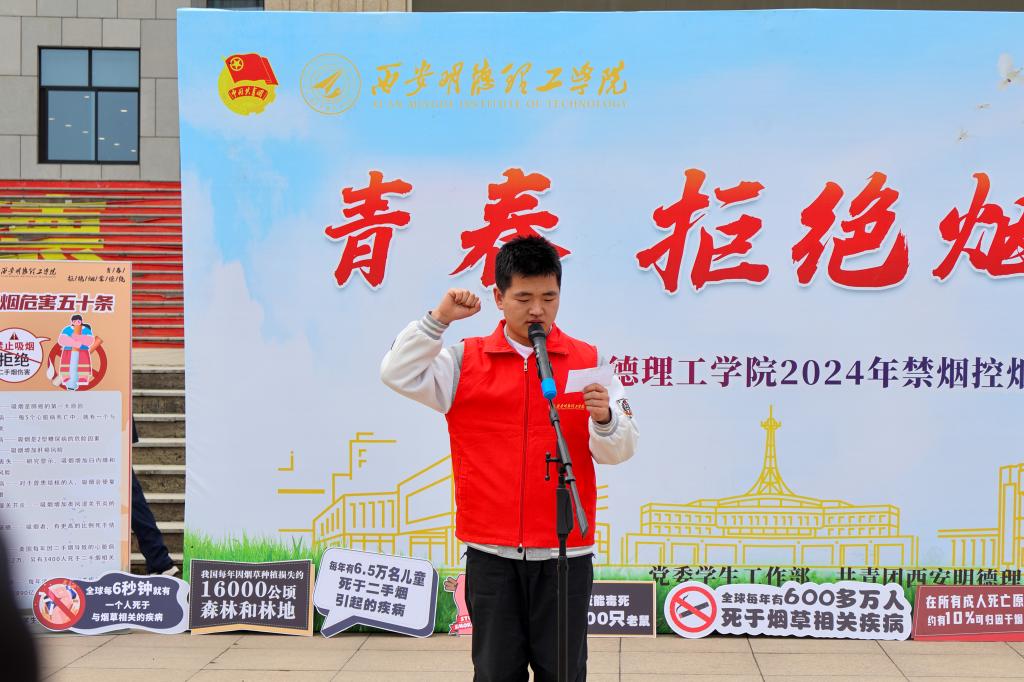 学校禁烟控烟学生倡导者、青年志愿者代表董宁萱宣读《禁烟控烟倡议书》,一是自觉远离烟草,珍爱身体健康;二是树立禁烟意识,共建无烟校园;三是加强自我管理,互相监督提醒;四是倡导文明健康,加强宣传引导。他深情呼吁同学们一起行动起来,为禁烟控烟工作深入到师生的心中尽一份心,为明德理工的文明校园称号行稳致远出一份力!为建设无烟校园、控烟明德贡献自己的力量!