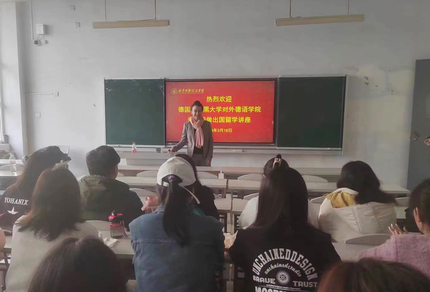 下午在育德楼109教室,Melanie Moll博士向我院德语专业学生介绍了慕大最新赴德交流项目:包括暑期研学项目、为期一月的带薪实习等。德语专业学生认真聆听,并在会场上积极询问相关事宜。