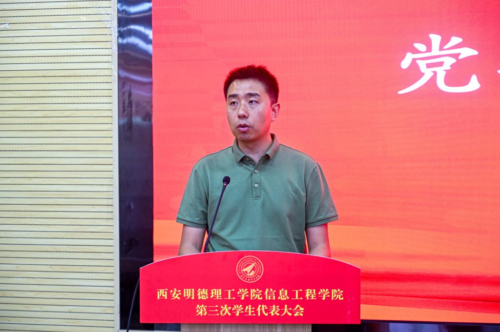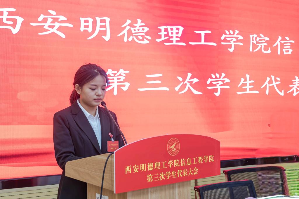 大会伊始,校学生会主席团成员王郑新迎致辞。她鼓励信息工程学院全体学生以本次大会为新的起点,把握时代赋予的机遇,迎接未来的挑战,共同推动信息工程学院和整个学校朝着既定目标稳步前进,为建设特色鲜明、国内一流、具有国际影响力的应用型民办大学贡献青春力量。