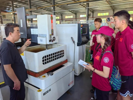 抵达公司后,企业负责人雷经理对大家的到来表示欢迎,带领师生们参观了公司的展厅,详细的介绍了他们打造的安全高效、节能环保的工业模式及加工精良、技术领先的工具产品,如手持式乳化液钻机、矿用乳化液带式锯、乳化液螺母拆装器等。在雷经理的带领下师生们来到了企业零件厂、装配厂、自动化车间等,通过实地参观与交流,师生们了解到了每台机器用途、产出和操作,近距离接触了产品的加工生产流程,切身体会到了如今科技创新发展的成果。