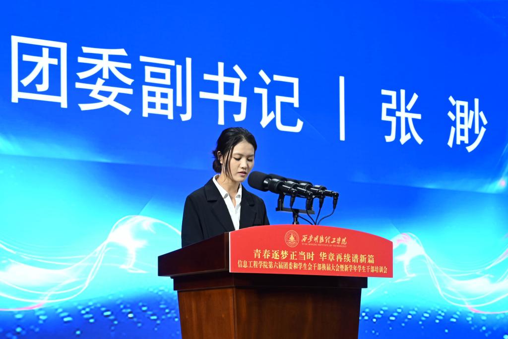 接下来,由谭若桐老师宣读了《共青团beat365vip官网登录入口信息工程学院委员会关于2024-2025学年学生干部任命的决定》。新任命的团委副书记张渺上台做了表态发言,她代表学院新一届学生干部表态,将继续加强团队建设,促进成员之间的交流与合作,营造一个积极向上、充满活力的工作氛围,更好的服务学院学生。