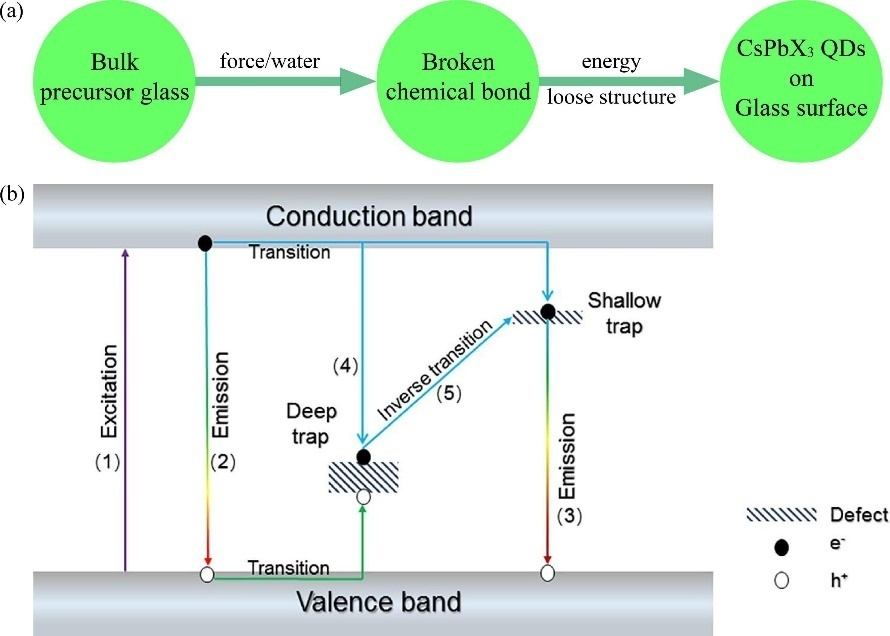 (钙钛矿量子点玻璃晶化机理及发光原理图)