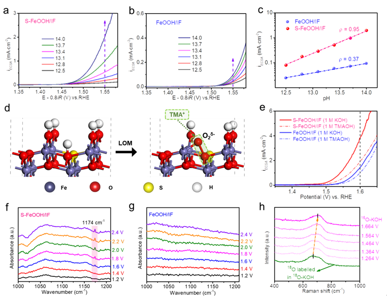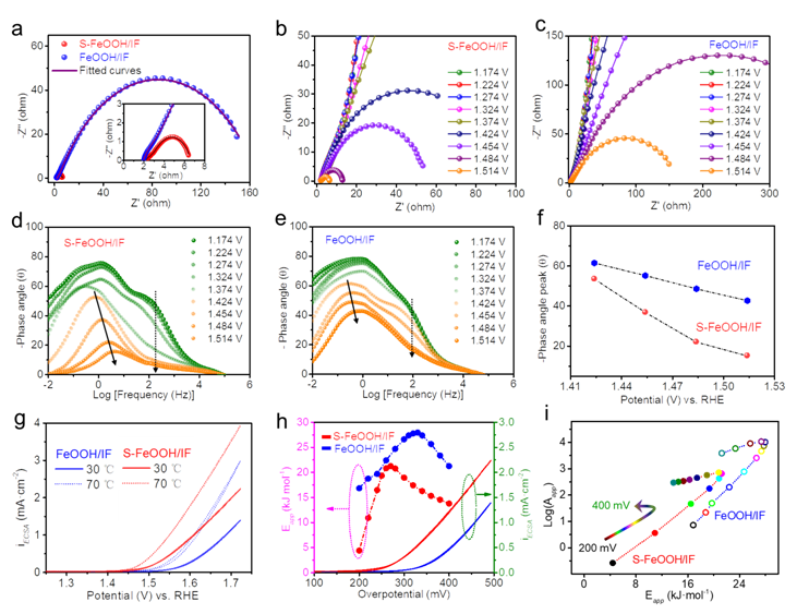 电解水制氢是目前获取可再生清洁氢能源的有效方式之一,是实现“碳达峰、碳中和”宏伟目标的重要途经。本论文针对目前商用钌铱等贵金属催化剂成本高、资源少、耐久性差等问题,提出采用化学腐蚀法在泡沫铁基底原位生长垂直于基底的硫掺杂羟基氧化铁纳米片(S-FeOOH)。系统的结构表征、电化学性能测试和理论模拟计算结果表明,FeOOH中铁和晶格氧反应活性都得到了充分激活,从而显著提高了本征OER活性,所得催化剂在10 mA cm−2电流密度下的过电位仅为244 mV。此工作提供了一种简单高效的表面工程策略获得低成本、高性能的OER电催化剂。