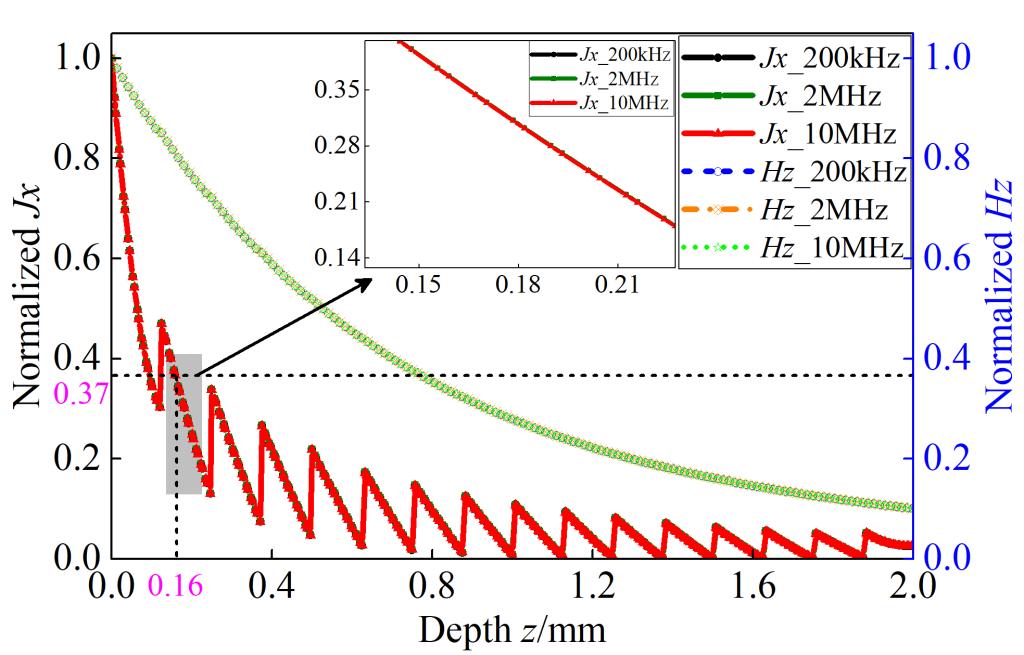 为满足CFRP损伤涡流检测的应用需求,本研究探索了电磁场在多层CFRP板结构中的传播、衰减与扩散特性,解决了多层导电介质交界面处的场量突变问题。研究结果表明,材料的电各向异性是电磁场快速衰减的关键因素,由波印廷定理知强电各向异性造成更多的能量损耗,使得电磁场的衰减特性与频率无关。铺层变化是影响电磁场衰减与扩散的又一重要因素,电磁场的衰减与扩散和相邻铺层角度差呈反比。从入射场角度看,激励源形状是影响电磁场传播特性的另一重要因素,电磁场的衰减与扩散和激励源形状呈反比。该研究结果为定量检测与评估CFRP结构深处缺陷奠定了理论基础,同时为涡流检测探头的设计/优化提供了理论依据。