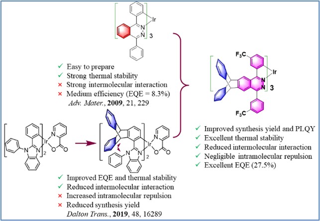 当前,有机发光二极管(OLED)是无背光源、无液晶的自发光显示,具有优异的色彩饱和度、对比度和反应速度,其发展带来了显示器技术的快速变革,已在手机、电视等电子产品中实现了商业应用,产业价值数百亿美元。环金属铱配合物由于其效率高和稳定性强的特点成为目前OLED发光材料的首选。但是其激发态寿命较长(通常在微秒级),导致其容易发生浓度淬灭,器件的稳定性不佳。为克服浓度淬灭的问题,团队在前期工作基础上,将三维刚性的三蝶烯位阻基团与铱配合物融合在一起,以克服分子间的π-π堆积作用。