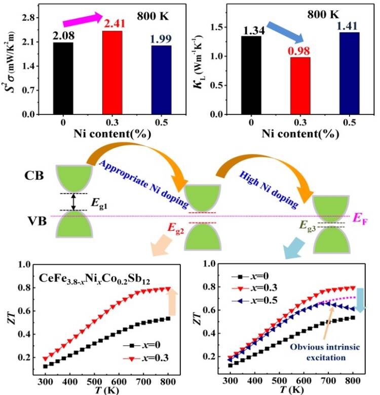 (合金化工程协同优化p型方钴矿材料电和热输运性能,并通过控制带隙减小,抑制高温本征激发)