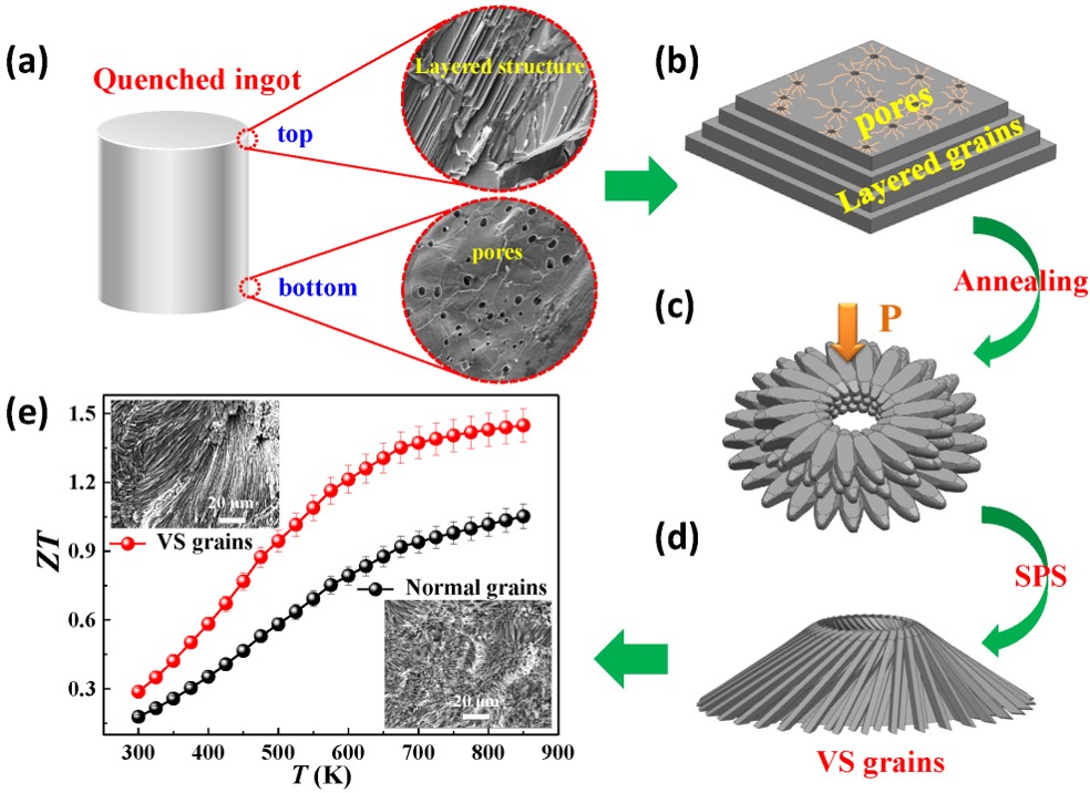 (具有涡旋-条状晶粒结构的(Ba,In)填充方钴矿热电材料Ba0.3In0.25Co4Sb12的(a-d)微结构形成示意图和(e)ZT值)