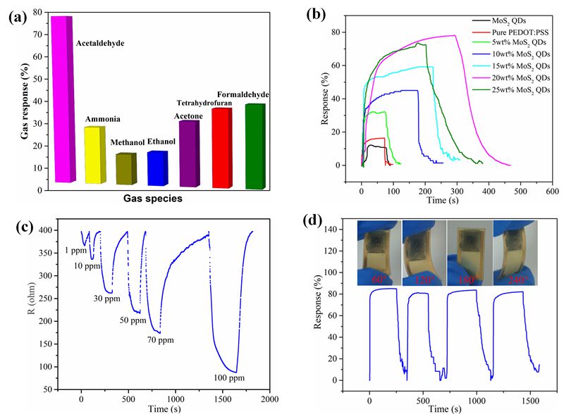 本研究采用原位聚合技术,将MoS2量子点(MoS2QDs)与聚(3,4-乙烯二氧噻吩):聚苯乙烯磺酸(PEDOT: PSS)进行复合,所制备的气体传感器检测限达到1 ppm。在长达三个多月时间,此传感器的响应保持稳定,在不同的弯曲角度(60°~ 240°)下工作对传感器的响应灵敏度无影响。此项研究为MoS2QDs/ PEDOT: PSS材料作为可穿戴气体传感器提供了一种崭新的思路,将引领室温下实时在线检测乙醛气体关键技术的发展。