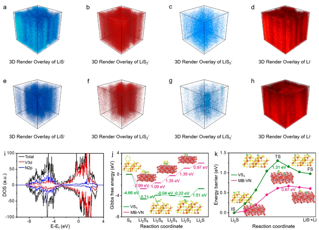 团队设计合成了一种具有丰富活性位点的多枝状氮化钒作为催化多硫化锂转化反应的催化剂。二次离子质谱和理论计算证实金属氮化物较高的化学吸附性与催化活性能够显著促进多硫化锂的转化,原位拉曼光谱表征揭示了多枝状氮化钒作为催化剂时能够明显抑制多硫化锂的穿梭效应。电化学测试表明,锂硫电池在–20到60 °C的温度范围内仍能正常工作,且循环稳定性较高,为锂硫电池在宽温域条件下的应用研究提供了参考。相关成果发表在纳米领域顶级期刊《ACS Nano》(中科院一区TOP期刊,IF为18.027)。beat365官网为论文第一单位,马连波博士和扬州大学王艳荣博士为第一作者,马连波博士、广东工业大学张伟博士和南京大学金钟教授为共同通讯作者。